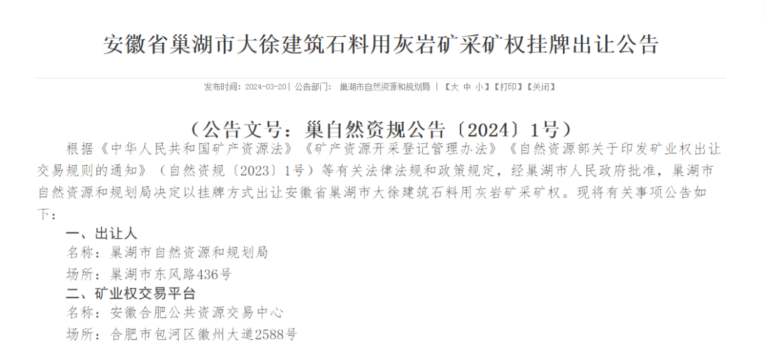 注:1.競買人須在公告期內完成注冊及報名材料上傳手續,因未在規定時間完成上述手續造成無法參與競價的,自行承擔相關責任。上述報名、文件獲取及競價等具體操作流程詳見《操作手冊》(本公告上傳附件3)。2.競買人一旦參與報名及競價,即視為對本公告內容的全部響應,自愿接受并同意按照相關程序參與本次出讓活動。本次采礦權掛牌出讓事宜可瀏覽:1.自然資源部門戶網站(http://www.mnr.gov.cn);2.巢湖市自然資源和規劃局門戶網站(https://www.chaohu.gov.cn/public/column/18931?type=2);3.安徽合肥公共資源交易中心網站(https://ggzy.hefei.gov.cn/)。