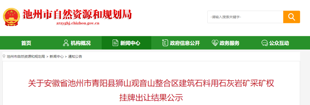 2024年3月6日至3月20日,青陽縣自然資源和規劃局在青陽縣公共資源交易服務中心(礦業權交易平臺)對安徽省池州市青陽縣獅山觀音山整合區建筑石料用石灰巖礦采礦權公開掛牌出讓,現將公開掛牌出讓結果公示如下: