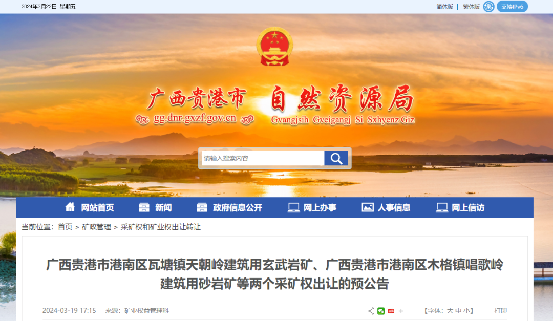 為保障園區、道路等基礎設施建設項目填方用土石需求,以及促進玄武巖深加工產業發展,推動廣西貴港市礦產資源高質量發展,貴港市計劃于2024年4月-6月份通過掛牌方式出讓廣西貴港市港南區瓦塘鎮天朝嶺建筑用玄武巖礦和廣西貴港市港南區木格鎮唱歌嶺建筑用砂巖礦兩個采礦權。
