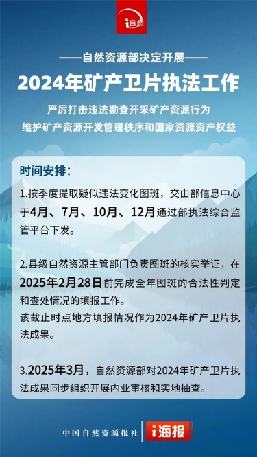 2025年3月,自然資源部對(duì)2024年礦產(chǎn)衛(wèi)片執(zhí)法成果同步組織開(kāi)展內(nèi)業(yè)審核和實(shí)地抽查。
