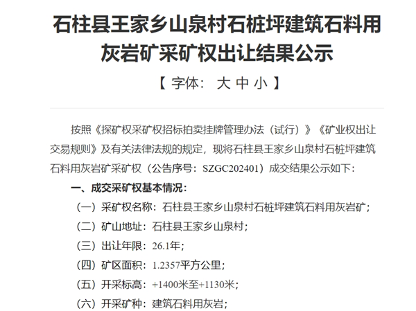 重慶市石柱縣成功出讓一宗砂石大礦。該礦開采礦種為建筑石料用灰巖,資源儲量約3.2億噸,生產規模950萬噸,出讓年限26.1年,成交價約7.4億元。