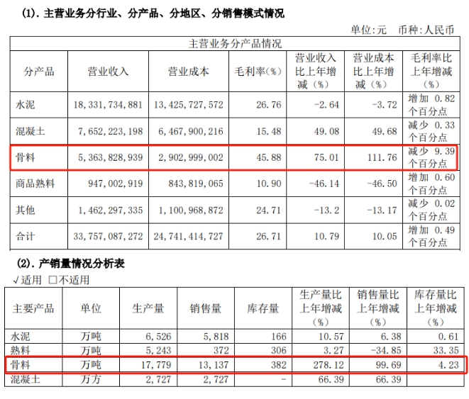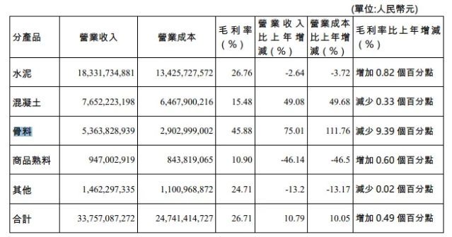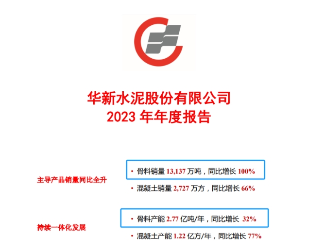 在骨料業(yè)務方面,2023年,華新水泥新增骨料產(chǎn)能6700萬噸,骨料年產(chǎn)能達2.77億噸,同比增長32%。骨料銷量增長6558萬噸,共銷售13137萬噸,同比增長100%,銷售骨料超53.6億元,較去年增長75.01%;毛利率45.88%,較去年下降9.39%。