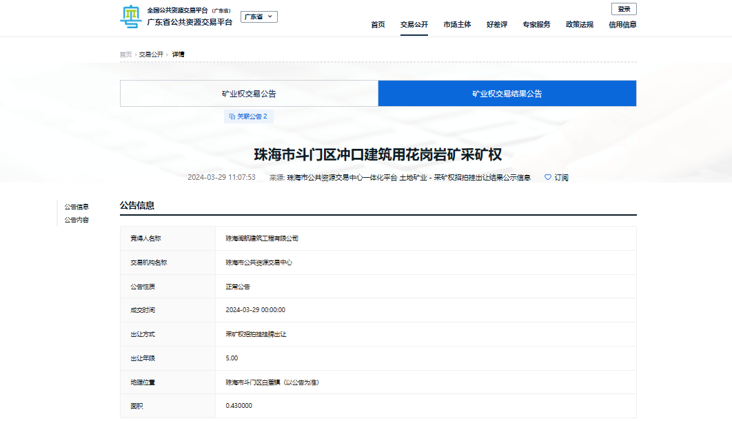 近日,珠海市公共資源交易中心成功競出珠海市斗門區沖口建筑用花崗巖礦采礦權。該礦權位于珠海市斗門區白蕉鎮北西343°方位,生產規模不低于200萬m?/年,可開采儲量721.53萬m?,出讓年限為五年,起始價為3800萬元。珠海閩航建筑工程有限公司最終以1.82億元競得此礦。