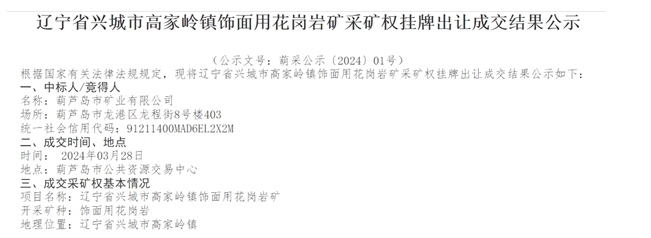 此次成交的采礦權位于遼寧省興城市高家嶺鎮,礦區面積4.8032平方千米。設計利用資源量近2億方(設計利用荒料量4719.31萬方、綜合利用碎石量近1.5億方),設計確定