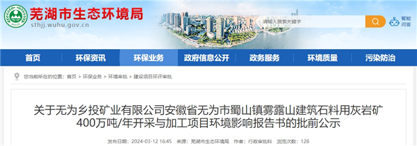 近日,安徽省蕪湖市生態環境局發布無為市蜀山鎮霧露山400萬噸/年砂石開采與加工項目環評批前公示。該項目總投資20億元,建設單位為無為鄉投礦業有限公司。