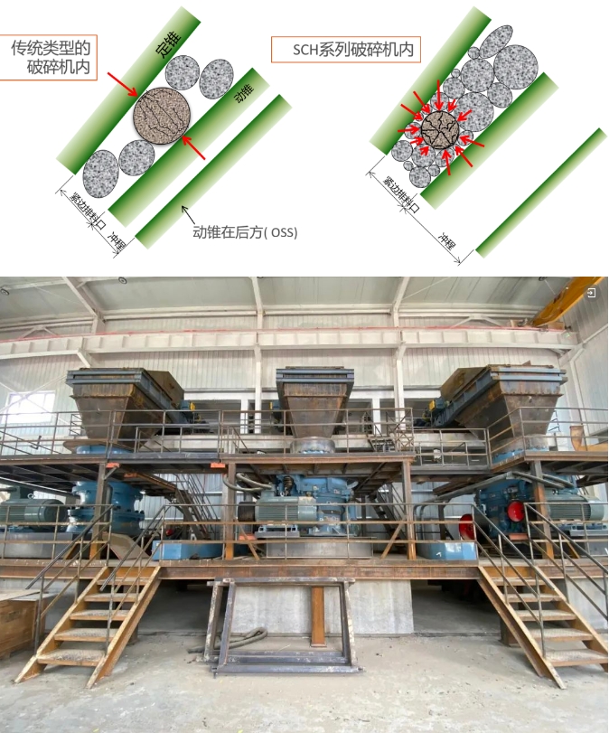 SCH系列多缸圓錐破碎機排料口鎖緊力大,可調(diào)節(jié)范圍寬,有較大的靈活性;排料口增大,破碎腔空間變大,產(chǎn)能隨之增大;產(chǎn)品形狀更整齊(正多面體形)、粒級更優(yōu)。
