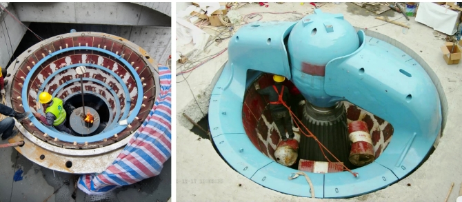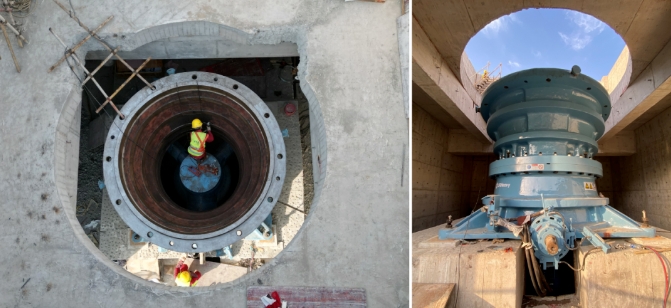 旋回破碎機上、中、下架體的連接螺栓數(shù)量多扭矩大,服務(wù)團隊提前準備好液壓扳手代替人工緊固螺栓,大大加快了螺栓鎖緊的速度,同時保持各個螺栓扭矩一致,縮短了安裝時間,提升了效率。