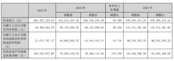 4月2日,湖南發展(000722)近日發布2023年年度報告,報告期內公司實現營業收入292,477,323.93元,同比下滑30.48%;歸屬于上市公司股東的凈利潤49,466,644.79元,同比下滑28.46%。