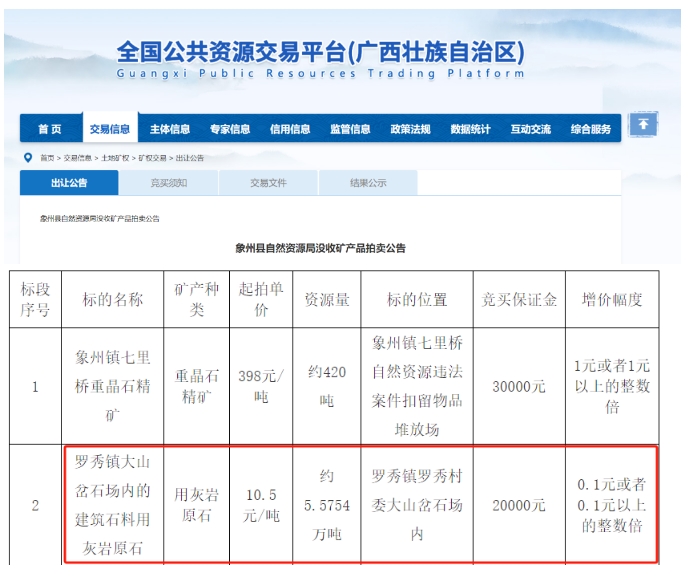 近日,廣西象州縣自然資源局發布沒收礦產品拍賣公告,約5.5754萬噸建筑石料用灰巖10.5元/噸起拍,拍賣時間:2024年4月10日上午10時00分。