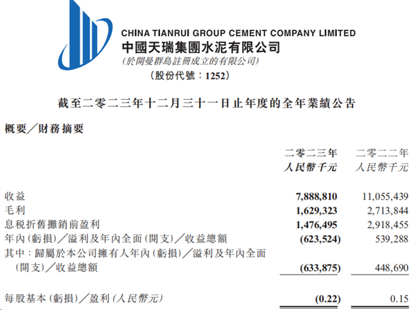日前,中國天瑞集團(tuán)水泥有限公司發(fā)布2023年度業(yè)績報(bào)告。該集團(tuán)取得收益人民幣78.89億元,同比減少28.64%;公司擁有人應(yīng)占虧損6.34億元,去年同期則溢利4.49億元。