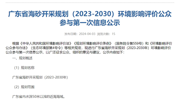 2024年4月3日,廣東省自然資源廳發(fā)布廣東省海砂開(kāi)采規(guī)劃(2023-2030)環(huán)境影響評(píng)價(jià)公眾參與第一次信息公示,規(guī)劃期限為2023年-2030年,規(guī)劃范圍為廣東省內(nèi)水深50米以淺的近海海域。