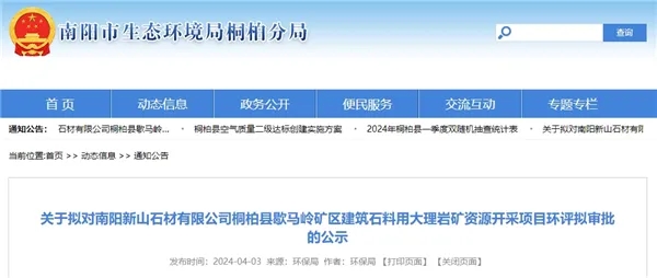 4月3日,河南省南陽市生態環境局桐柏分局發布了南陽新山石材有限公司年產550萬噸砂石開采項目環評擬審批的公示。該項目總投資6億元,服務年限29.7年,施工工期6個月。