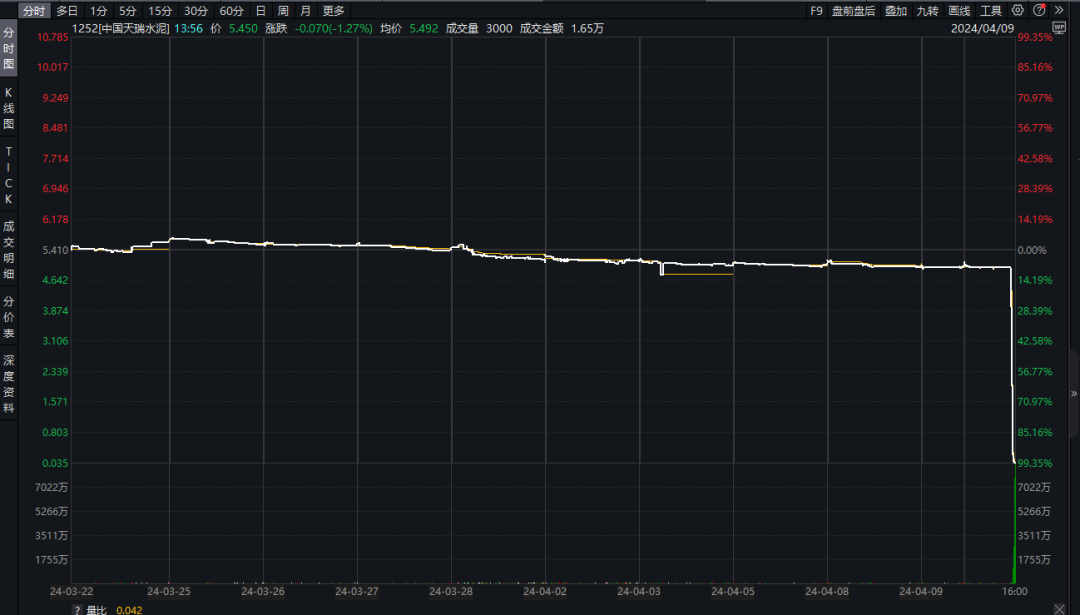 9日,中國(guó)水泥巨頭天瑞集團(tuán)在港股收盤(pán)前突然閃崩,股價(jià)暴跌99%,總市值只剩港幣1.4億元。一天內(nèi)蒸發(fā)145.48億元。從4.92港元/股跌至收盤(pán)價(jià)0.048港元/股。而在此之前,中國(guó)天瑞水泥股價(jià)表現(xiàn)平穩(wěn),交易稍顯清淡。