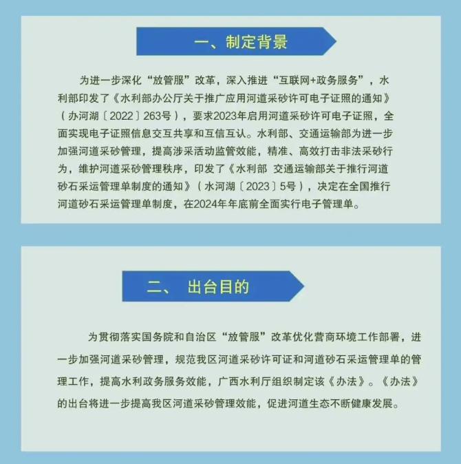 為貫徹落實國務院和自治區“放管服”改革優化營商環境工作部署,進一步加強河道采砂管理,規范我區河道采砂許可證和河道砂石采運管理單的管理工作,提高水利政務服務效能,廣西水利廳組織制定該《辦法》。《辦法》的出臺將進一步提高我區河道采砂管理效能,促進河道生態不斷健康發展。