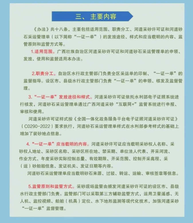 《辦法》共十八條,主要包括適用范圍、職責分工、河道采砂許可證和河道砂石采運管理單(以下簡稱“一證一單”)的發放途徑、樣式和應當載明的內容、監管原則和監管方式等。
