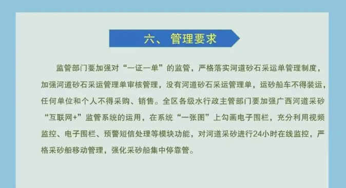監管部門要加強對“一證一單”的監管,嚴格落實河道砂石采運單管理制度,加強河道砂石采運管理單審核管理,沒有河道砂石采運管理單,運砂船車不得裝運,任何單位和個人不得采購、銷售。全區各級水行政主管部門要加強廣西河道采砂“互聯網+”監管系統的運用,在系統“一張圖”上勾畫電子圍欄,充分利用視頻監控、電子圍欄、預警短信處理等模塊功能,對河道采砂進行24小時在線監控,嚴格采砂船移動管理,強化采砂船集中停靠管。