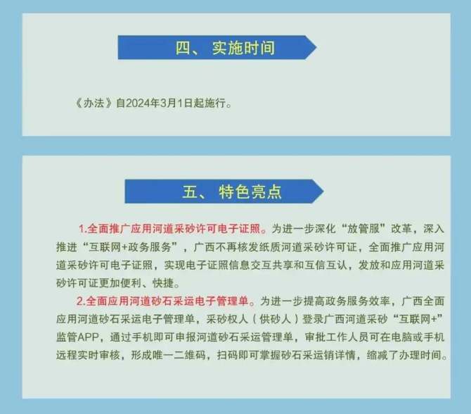 (一)全面推廣應用河道采砂許可電子證照。為進一步深化“放管服”改革,深入推進“互聯網+政務服務”,廣西不再核發紙質河道采砂許可證,全面推廣應用河道采砂許可電子證照,實現電子證照信息交互共享和互信互認,發放和應用河道采砂許可證更加便利、快捷。