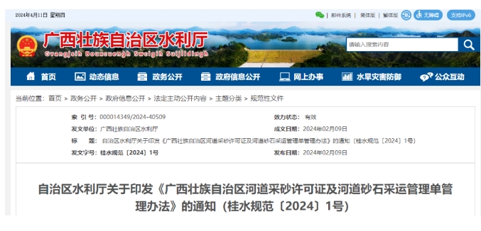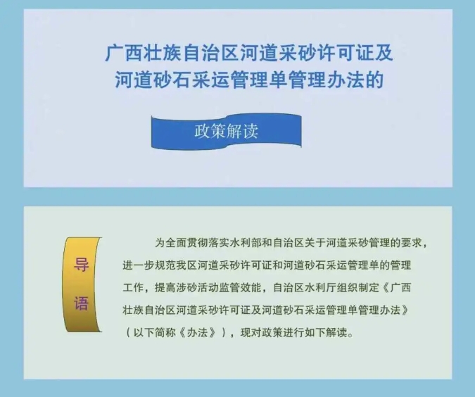 為全面貫徹落實水利部和廣西自治區關于河道采砂管理的要求,進一步規范廣西河道采砂許可證和河道砂石采運管理單的管理工作,提高涉砂活動監管效能,廣西壯族自治區水利廳組織制定《廣西壯族自治區河道采砂許可證及河道砂石采運管理單管理辦法》。