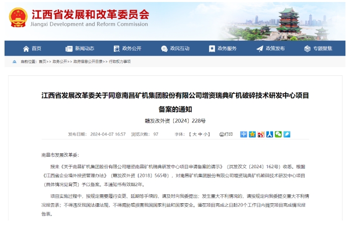 南礦集團擬增資瑞典礦機破碎技術(shù)研發(fā)中心項目1200萬元近日,江西省發(fā)展改革委發(fā)布了《關(guān)于同意南昌礦機集團股份有限公司增資瑞典礦機破碎技術(shù)研發(fā)中心項目備案的通知》。通知表示,根據(jù)《江西省企業(yè)境外投資管理辦法》(贛發(fā)改外資〔2018〕565號),對南昌礦機集團股份有限公司增資瑞典礦機破碎技術(shù)研發(fā)中心項目予以備案。