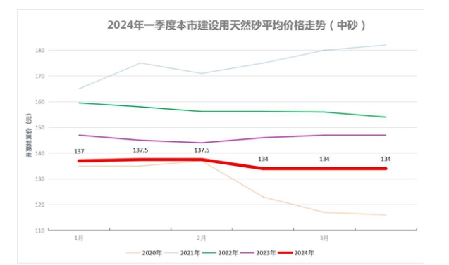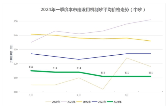 4、2024年一季度,供應端機制砂貨源充足加上長江沿線天然砂補充供應,建設用天然砂價格總體平緩、機制砂價格緩慢下降。經過近幾年市場需求結構發生的變化, 上海市混凝土生產企業對機制砂應用的不斷完善,以及機制砂生產企業數量和規模逐年擴大,滿足了 上海市建設用砂的需求,目前 上海天然砂中砂龍吳路調研價122元/噸,攪拌站開票結算價平均134元/噸;機制砂中砂龍吳路調研價101元/噸,攪拌站開票結算價平均111元/噸,價格已基本接近2020年一季度價格水平。