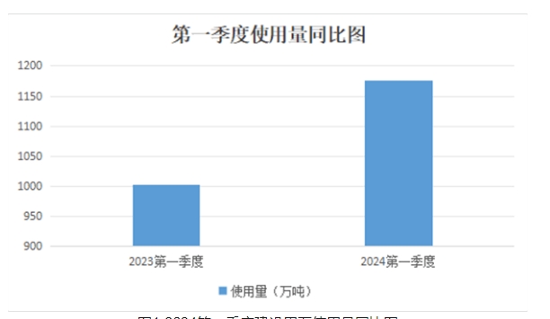 第一季度建設用石使用量達到1176萬噸,同比2023年第一季度( 1002萬噸)增幅達到17.36%;環比2023年第四季度( 2067萬噸)下降43.35%。