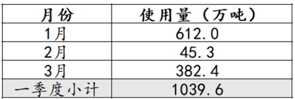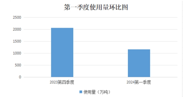1、2024第一季度的使用量達到了1176萬噸,遠高于2023年的同期1002萬噸,增長了17.36%;環比2023年第四季度2067萬噸,下降了43.35%。