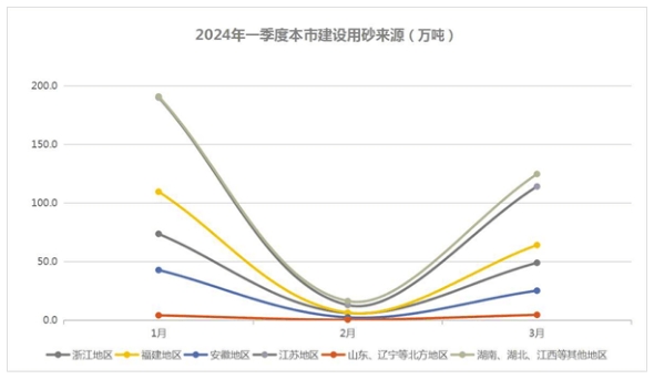 2024年一季度本市建設用砂主要來源于進滬運輸便捷的長江沿線地區以及同樣具備內河和海運條件的砂源交易聚集地的江蘇,其中湖南、湖北、江西等地區占32%,江蘇地區占31%,福建地區占17%,浙江地區占12%,安徽地區占7%,北方地區占1%。