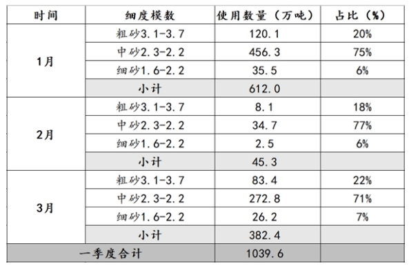 根據供應商質保書數據,2024年一季度 上海市建設用砂使用粗中細分布情況: