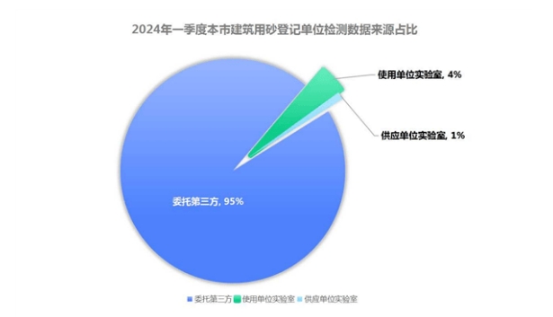 2024年一季度共有182家供應商開具質保書。委托第三方檢測機構檢測的173家,占95%;使用單位合作實驗室檢測的7家,占4%;另外2家,占1%,自己是生產單位又是登記供應商,利用自己內部實驗室檢測。根據質保書信息,供應上海的建設用砂均為合格。