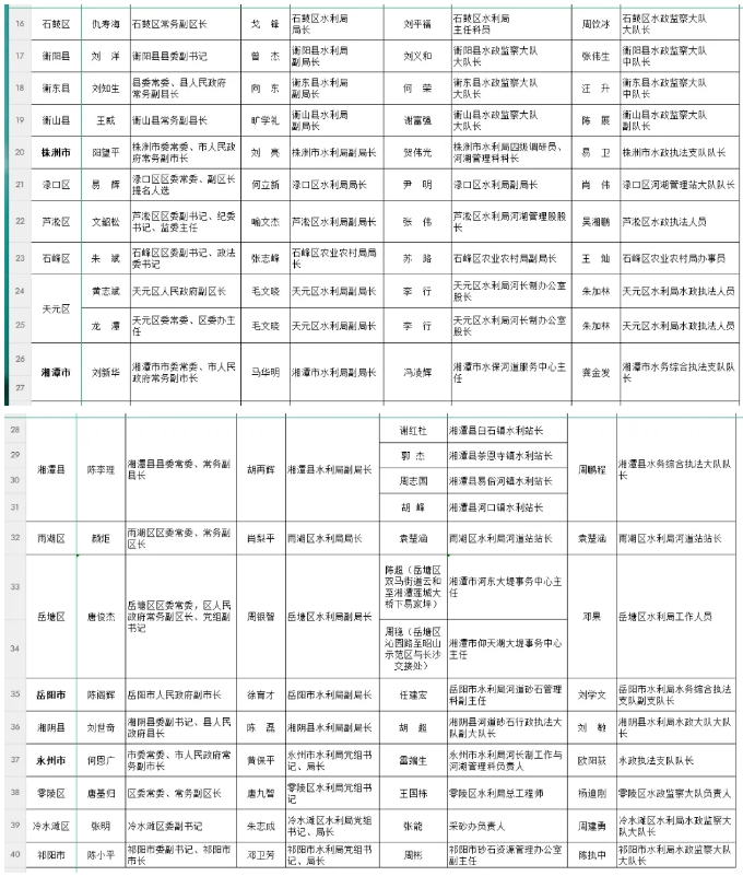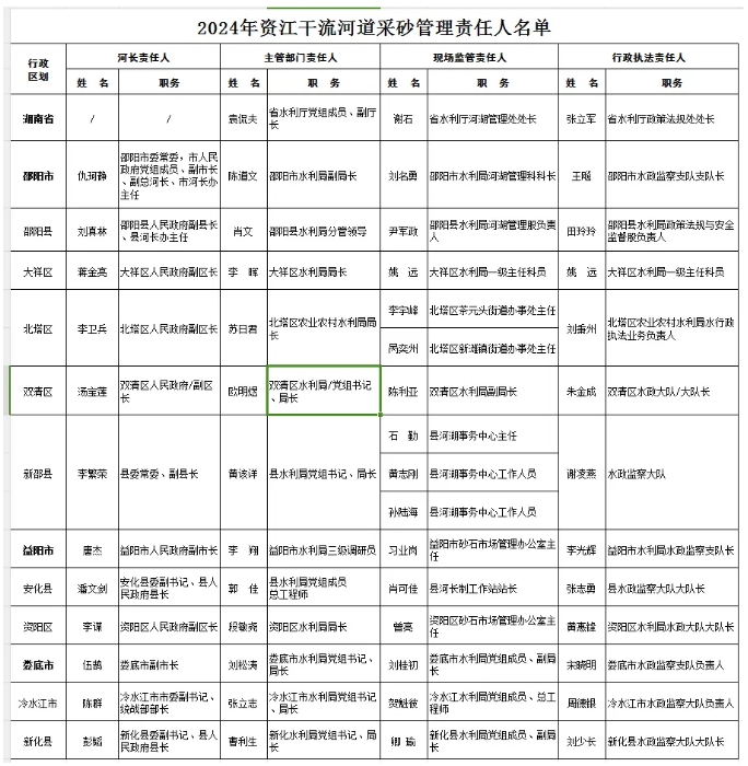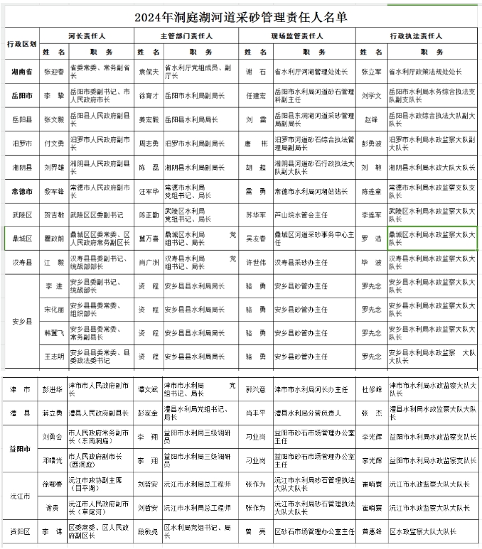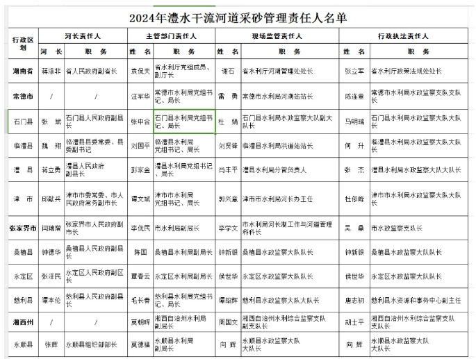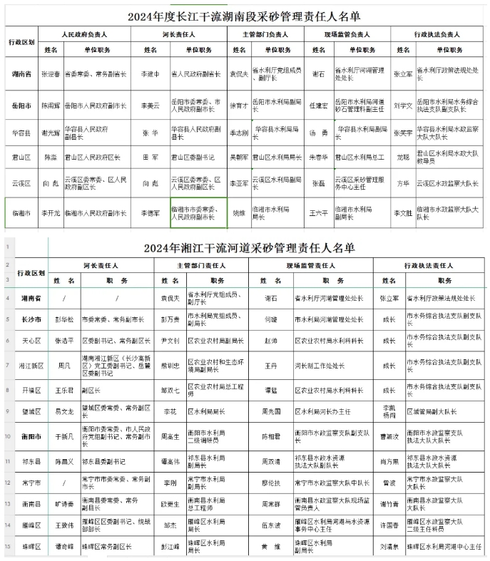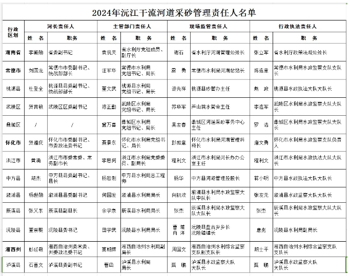 根據《長江河道采砂管理條例》《湖南省河道采砂管理條例》《水利部關于河道采砂管理工作的指導意見》及近期水利部、長江水利委員會關于河道采砂管理工作要求,現公告2024年度長江干流湖南段及湘資沅澧四水干流、洞庭湖河道采砂管理責任人名單。