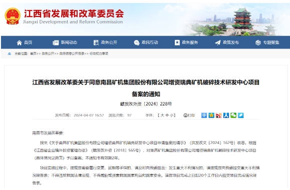 近日,江西省發(fā)展改革委發(fā)布了《關(guān)于同意南昌礦機(jī)集團(tuán)股份有限公司增資瑞典礦機(jī)破碎技術(shù)研發(fā)中心項(xiàng)目備案的通知》。通知表示,根據(jù)《江西省企業(yè)境外投資管理辦法》(贛發(fā)改外資〔2018〕565號(hào)),對(duì)南昌礦機(jī)集團(tuán)股份有限公司(下稱“南礦集團(tuán)(001360)”)增資瑞典礦機(jī)破碎技術(shù)研發(fā)中心項(xiàng)目予以備案。