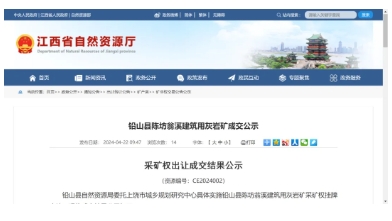 鉛山縣陳坊翁溪建筑用灰巖礦采礦權出讓成交結果公示