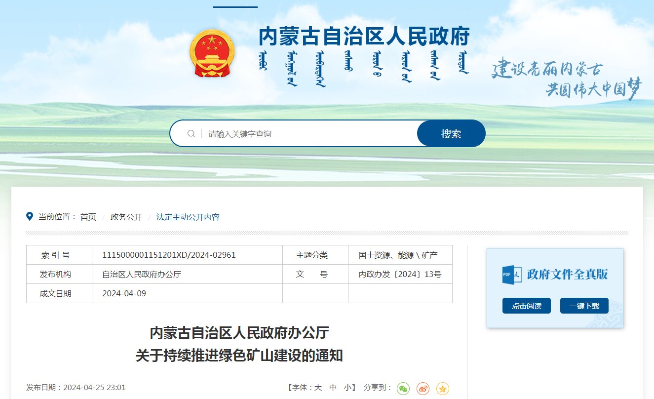 4月25日,內蒙古發布《關于持續推進綠色礦山建設的通知》指出,到2028年底,綠色礦山建設工作機制更加完善,持證在產的80%以上大中型礦山要達到綠色礦山標準。到2030年底,持證在產的全部大中型礦山要達到綠色礦山標準,不符合綠色礦山標準的礦山依法逐步退出市場;持證在產的小型礦山和剩余儲量可采年限不足3年的生產礦山應符合綠色開采基本要求,按照自治區綠色礦山建設評價指標中的約束性指標要求進行建設生產管理,重點做好礦山土地復墾與生態修復和礦山廢氣、廢水、廢渣及揚塵等污染物達標排放工作。