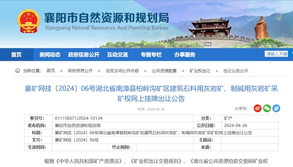 該項目位于南漳縣武安鎮三股泉村,礦權名稱湖北省南漳縣柏嶺溝礦區建筑石料用灰巖礦、制堿用灰巖礦,年生產規模建筑石料用灰巖礦500萬噸,掛牌起始價1.15億元(11489萬元),出讓年限21.3年(含基建期1年)。