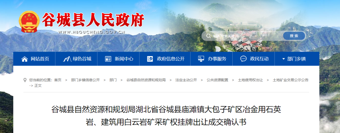 2024年4月28日,湖北谷城縣自然資源和規劃局和湖北國鑫礦業有限公司簽訂谷城縣廟灘鎮大包子礦區冶金用石英巖、建筑用白云巖礦采礦權掛牌出讓成交確認書,開采區塊范圍內建筑用白云巖總資源量為25515萬噸。年生產規模520萬噸,約1.98億元競得。