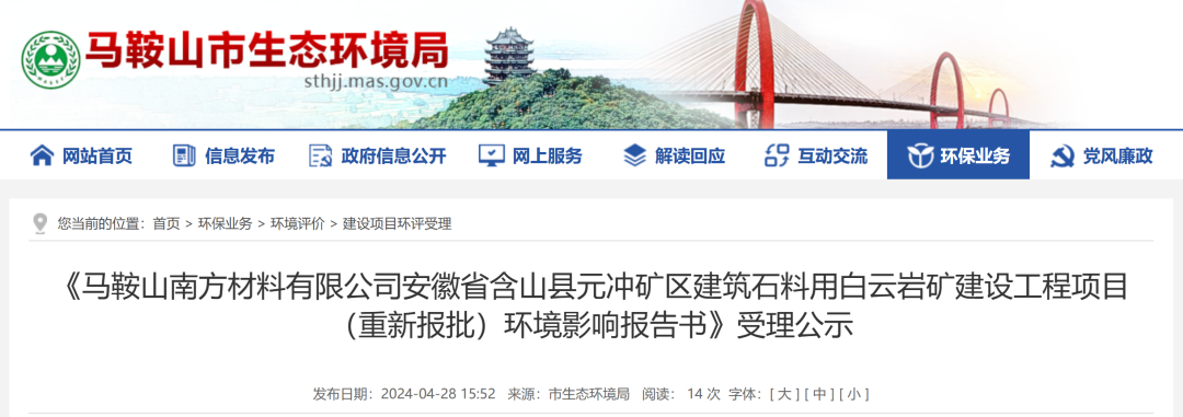 近日,據(jù)安徽省馬鞍山市生態(tài)環(huán)境局消息,該局受理了《馬鞍山南方材料有限公司安徽省含山縣元沖礦區(qū)建筑石料用白云巖礦建設(shè)工程項目(重新報批)環(huán)境影響報告書》。項目總投資18億!該項目將由整體開采1500萬噸/年將改為兩期建設(shè)。一期年產(chǎn)800萬噸砂石生產(chǎn)線,二期為年產(chǎn)700萬噸砂石生產(chǎn)線。