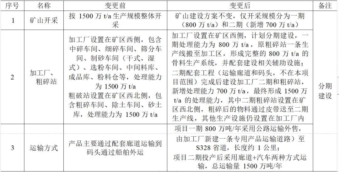 粗碎站建設(shè)、運輸方式三個方面變化。由整體開采改為分期建設(shè),開采規(guī)模分為一期(800 萬 t/a)和二期(新增 700 萬 t/a),加工廠設(shè)置布局相應改變,運輸方式由廊道配合船運改為公路運輸+廊道運輸。具體內(nèi)容如下表。