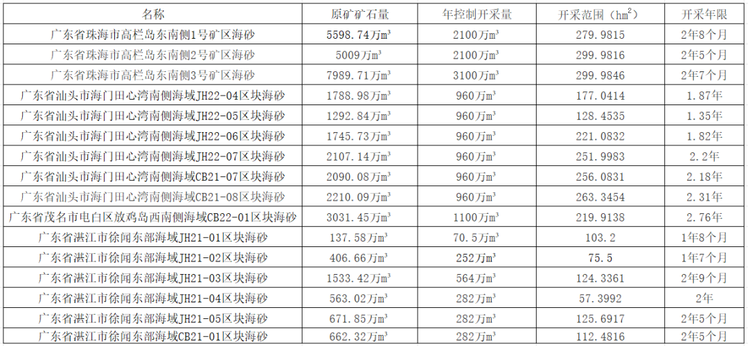 項目已通過環(huán)境影響報告。根據(jù)公布的環(huán)評報告,16個項目海砂儲量合計約3.68億方,年總控制開采量達1.6億方。該礦權是否能順利出讓,中國砂石協(xié)會將持續(xù)關注!