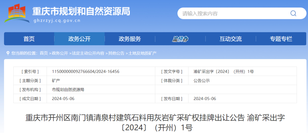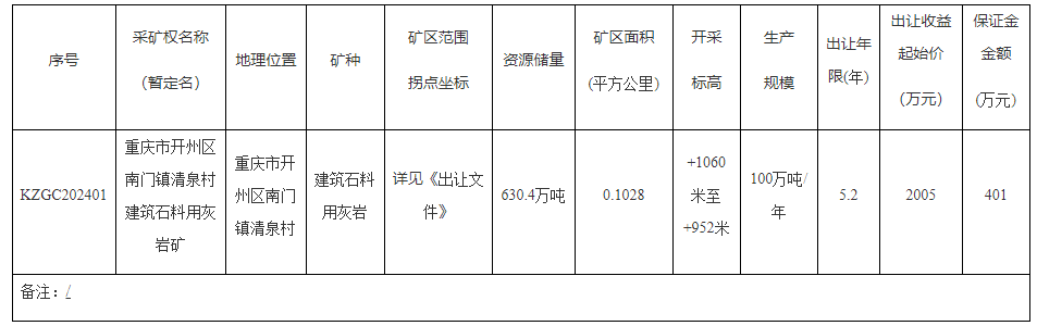 重慶市開州區南門鎮清泉村建筑石料用灰巖礦采礦權掛牌出讓公告