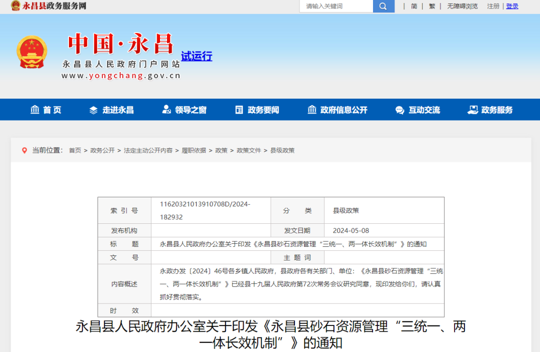 為深入貫徹落實習近平總書記關于自然資源保護和利用的指示批示精神,合理保護開發利用縣域砂石資源,為全縣經濟發展形成實物工作量提供砂石資源保障,甘肅省永昌縣根據相關法律法規規定,結合實際,制定全縣砂石資源管理“三統一、兩一體”長效機制,推動建立“設施完善、管理科學、監管有力、采砂有序”的砂石資源管理新秩序。