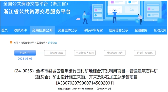 據了解,2023年10月,金華交投建筑材料發展有限公司以40100萬元競得該項目礦權。該礦資源儲量2487.07萬噸,生產規模400萬噸/年,出讓期限7年。金華交投建筑材料發展有限公司為金華市交通投資集團有限公司全資控股的國有企業。本次招標企業為金華交投建筑材料發展有限公司的子公司。