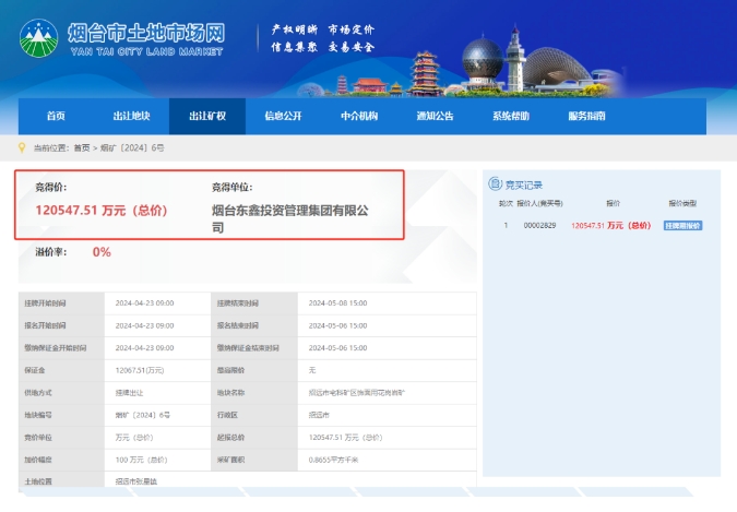 據了解,競得人煙臺東鑫投資管理集團有限公司是招遠市國有資產監督管理局和山東招金集團有限公司合資成立,屬于招遠市國有資產監督管理局控股的85%的國有企業。經營建筑用石加工;建筑材料銷售等業務。