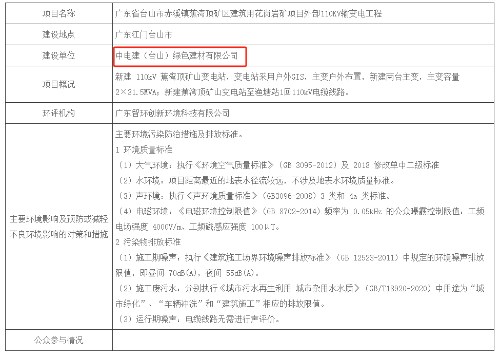 近日,江門市生態環境局臺山分局擬對廣東省臺山市赤溪鎮蕉灣頂礦區建筑用花崗巖礦項目外部110KV輸變電工程環境影響評價文件作出批準決定的公示。