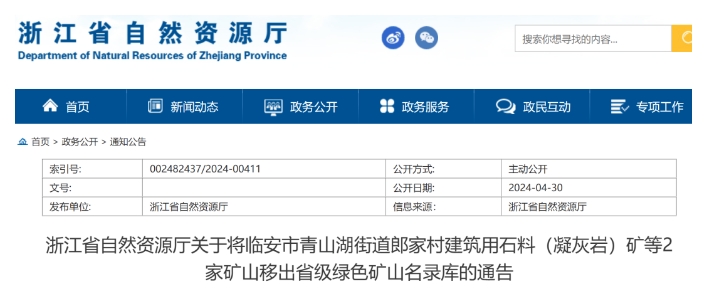 近日,浙江省自然資源廳發布關于將臨安市青山湖街道郎家村建筑用石料(凝灰巖)礦以及三門縣健跳鎮門頭咀石礦山移出省級綠色礦山名錄庫的通告。