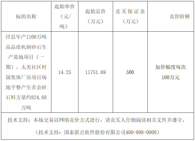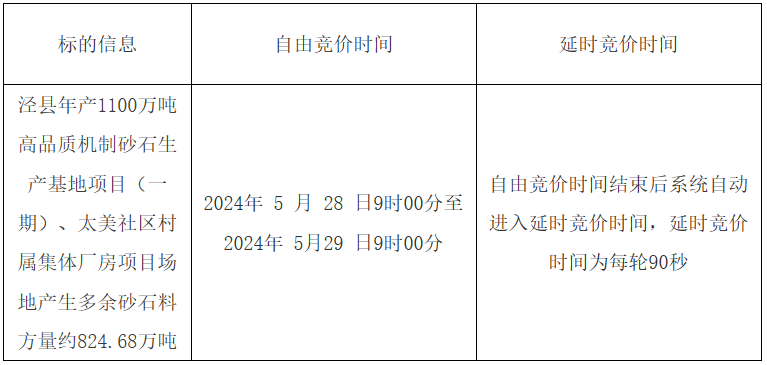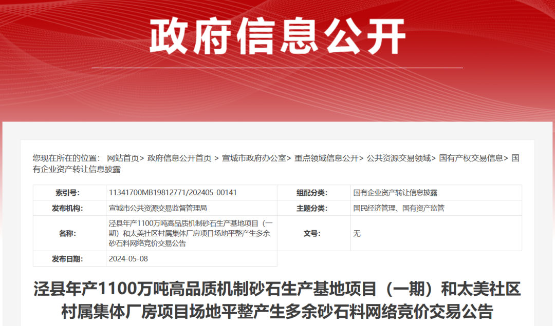 近日,安徽宣城公共資源交易監督管理局發布涇縣年產1100萬噸高品質機制砂石生產基地項目(一期)和太美社區村屬集體廠房項目場地平整產生多余砂石料網絡競價交易公告。