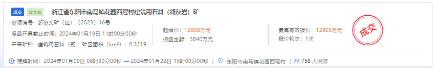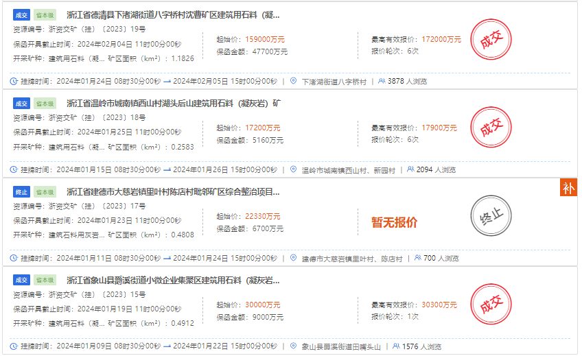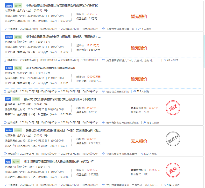 自2024年1月1日起,浙江省共掛牌出讓11宗砂石礦權,其中已成交6宗,中止1宗。未成交1宗,正在公告3宗。