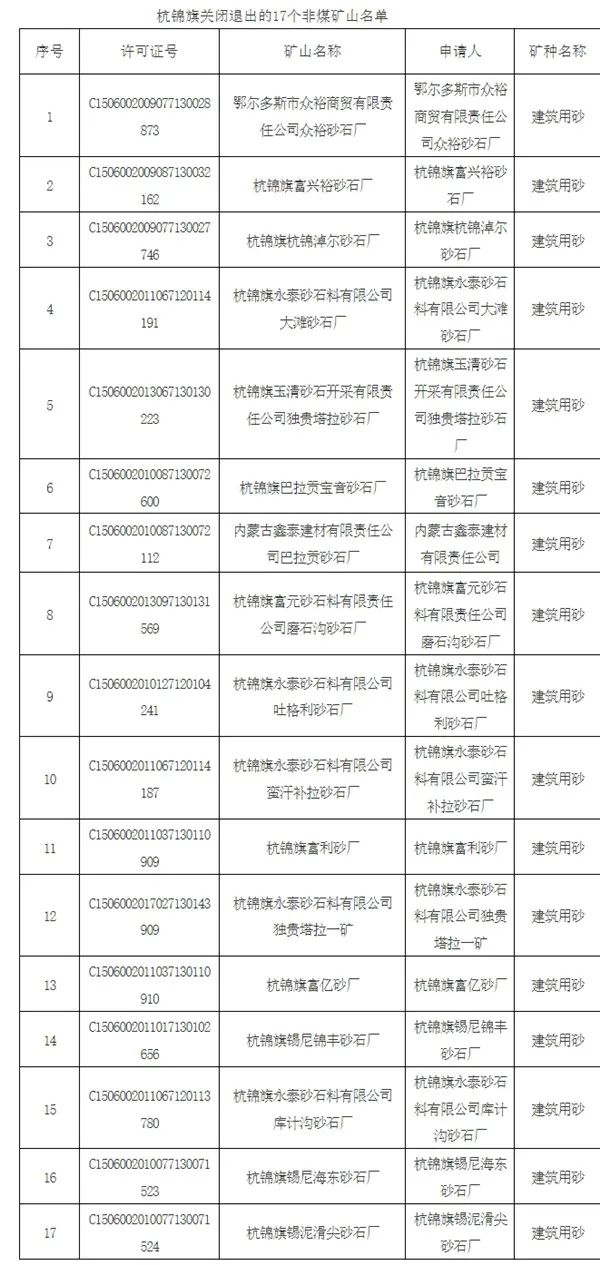 日前,內蒙古鄂爾多斯杭錦旗人民政府發布公告稱,為深入貫徹落實習近平生態文明思想,持續打好污染防治攻堅戰,加快解決生態環境突出問題,持續改善生態環境質量,根據《中華人民共和國礦產資源法》《礦產資源開采登記管理辦法》《自然資源部關于進一步完善礦產資源勘查開采登記管理的通知》(自然資規〔2023〕4號)及《鄂爾多斯市河長辦關于印發〈鄂爾多斯市河道采砂管理工作指導意見(試行)>的通知》(鄂河長辦發〔2020〕51號)要求,現對我旗境內的17個非煤礦山予以關閉退出(后附名單)。