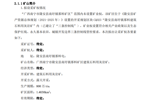 2024年5月9日,廣西南寧隆安縣自然資源局發布《廣西南寧市隆安縣南圩鎮那料礦區建筑石料用灰巖礦礦山地質環境保護與土地復墾方案》,擬出讓該項目采礦權。該項目查明資源儲量約2.4億噸,設計年產800萬噸,礦山可服務年限約為29年。
