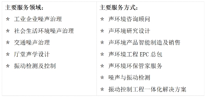 集團是集聲環境咨詢顧問、研究設計、智能制造、工程總包、環保管家服務、噪聲與振動檢測、振動控制、達標驗收、售后服務為一體的聲環境產業綜合服務商。有先進的理念、精湛的技術、合理的工藝、嚴苛的標準、優質的服務。業務領域涵蓋交通、鋼鐵、水泥、石油、化工、電力、航空航天、醫藥、食品、制造和社會生活環境等領域。