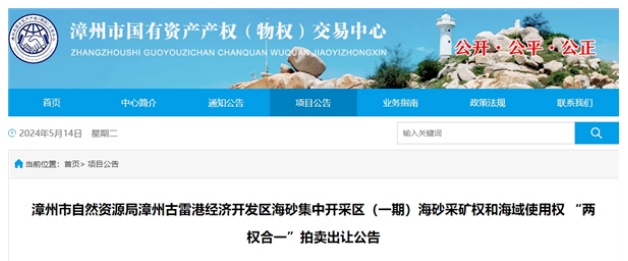 近日,福建省漳州市國有資產產權(物權)交易中心發布漳州古雷港經濟開發區海砂集中開采區(一期)拍賣出讓公告。該項目原礦礦石量1905.06萬方,開采年限3年,起始價約2.8億元,折算14.7元/方。拍賣時間為2024年5月30日。